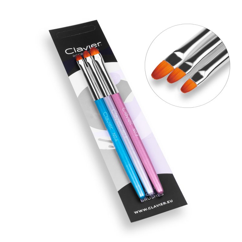 Zestaw pędzelków do żelu Tricolor, to rewelacyjny zestaw pędzelków do żelu o różnych wielkościach (4mm, 6mm, 8mm) do nakładania żelu. Zestaw składa się z 3 pędzelków w najpopularniejszym kształcie kociego języczka o różnej długości, które zdobi metalowa skuwka i drewniana rączka w pastelowych kolorach.