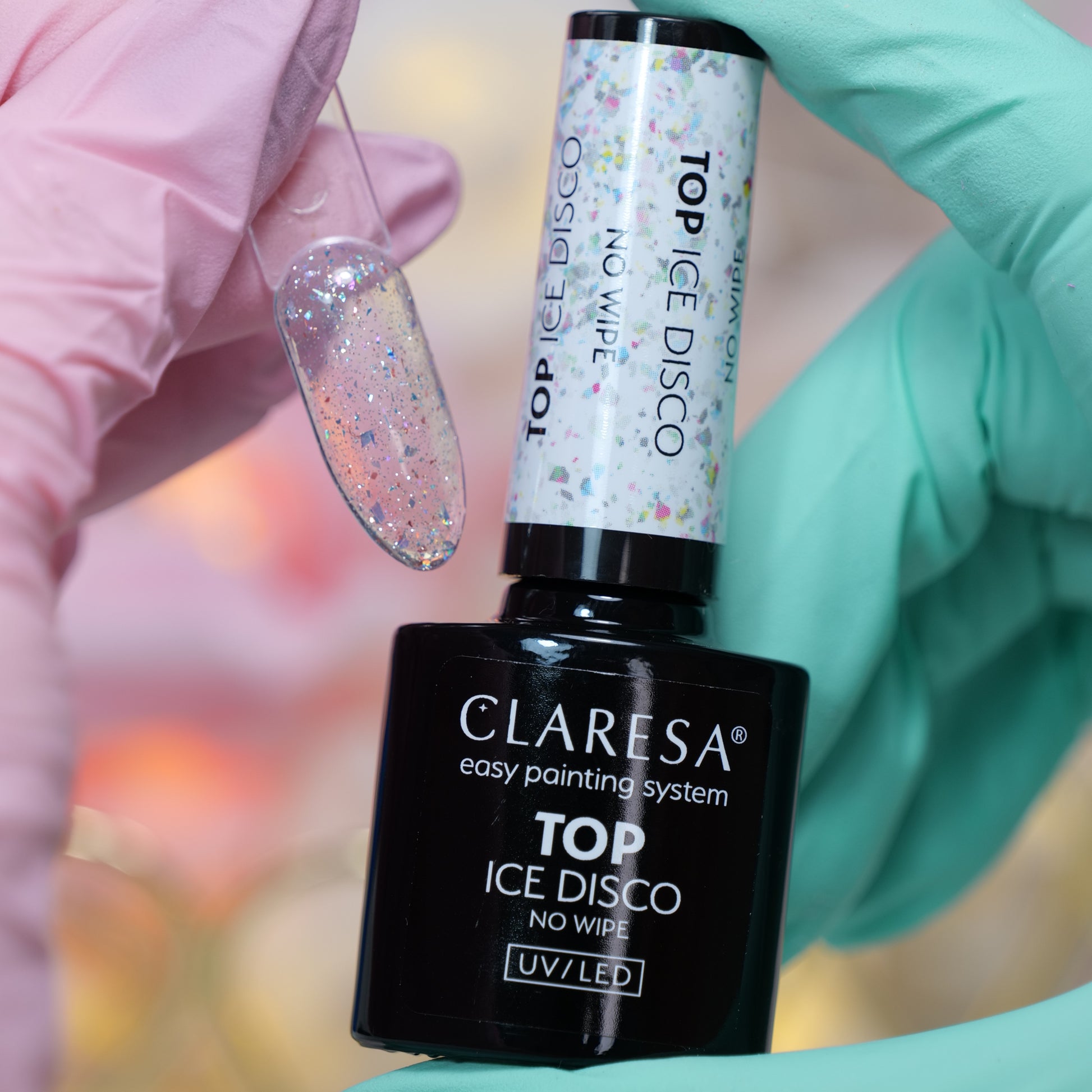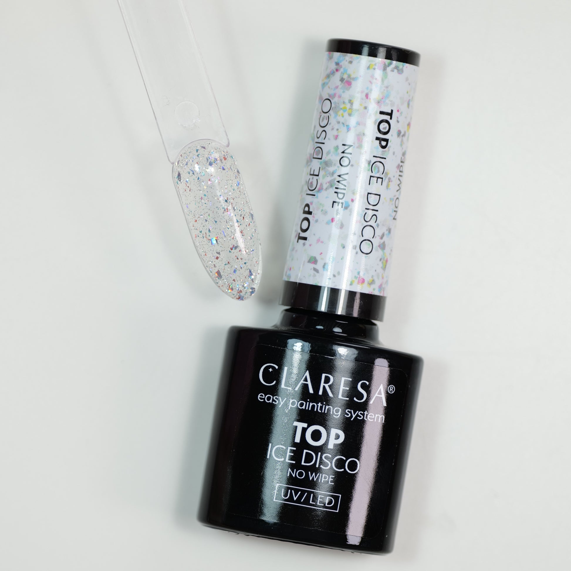 TOP NO WIPE ICE DISCO 5g to transparentny top z kawałkami srebrnej folii, który w jednej chwili zamienia klasyczny manicure w stylizację pełną blasku i elegancji.